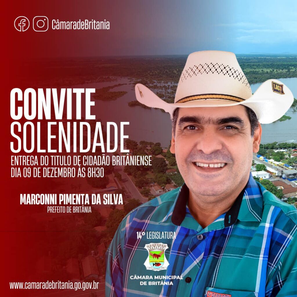 O Presidente da Câmara Municipal de Britânia Gilmar Vieira em nome dos demais Vereadores convida toda população Britâniense a participarem da Sessão Solene para entrega do título de cidadão Britâniense ao Prefeito Marconni Pimenta, que acontecerá dia 09 de Dezembro às 8H30 no Plenário da Câmara Municipal de Britânia.