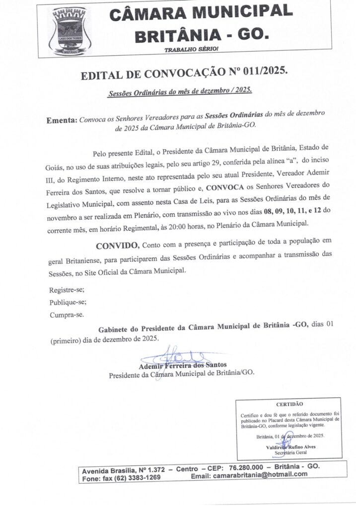 EDITAL Nº 011/2025 CONVOCAÇÃO PARA SESSÃO ORDINÁRIAS DO MÊS DE DEZEMBRO DE 2025.