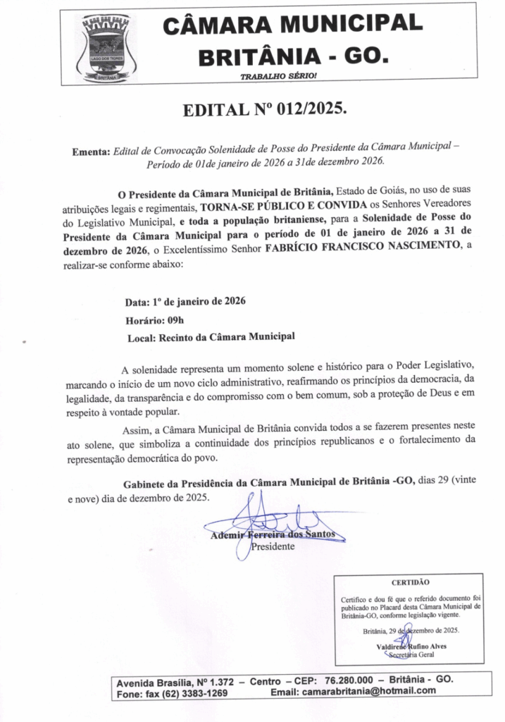 EDITAL Nº 012/2025 CONVOCAÇÃO PARA SOLENIDADE DE POSSE DO PRESIDENTE DA CÂMARA MUNICIPAL 2026