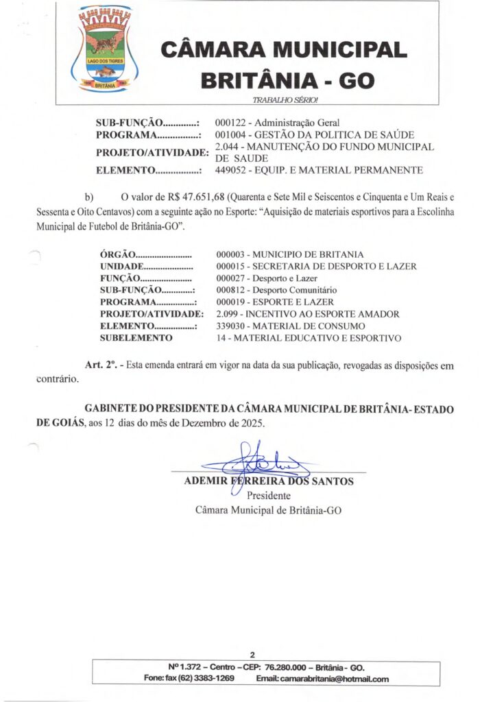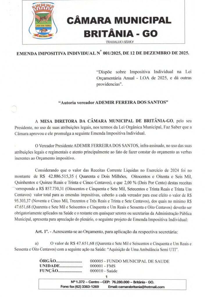 EMENDA IMPOSITIVA INDIVIDUAL N° 001/2025, DE 12 DE DEZEMBRO DE 2025.