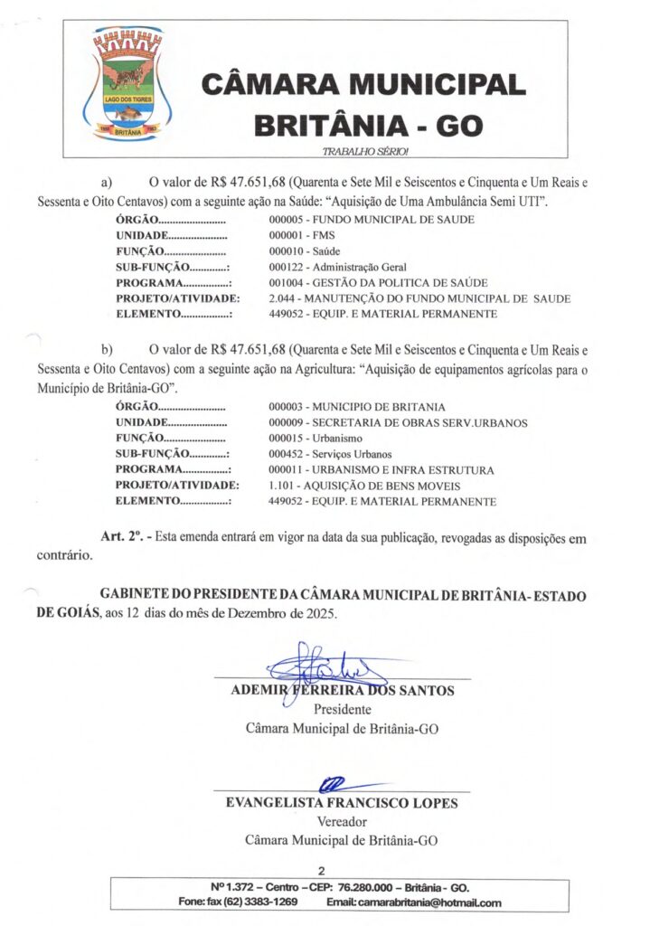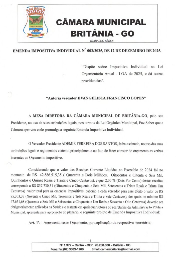 EMENDA IMPOSITIVA INDIVIDUAL N° 002/2025, DE 12 DE DEZEMBRO DE 2025.